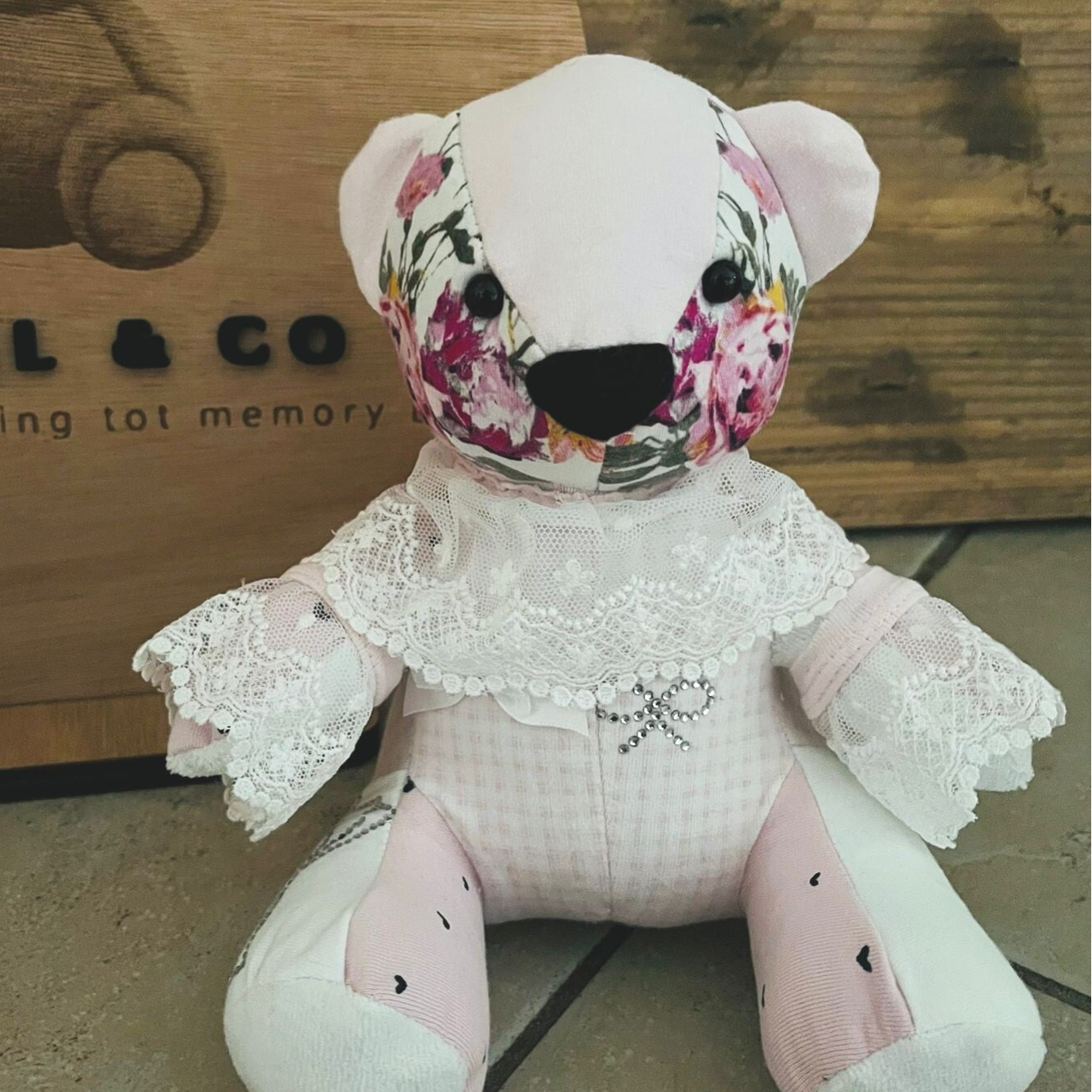 Wij gebruiken enkel de stoffen die jij opstuurt. Zo is het memory vriendje heel persoonlijk en een unieke herinnering. Enkel het neusje van de beer wordt gemaakt met zwart vilt, de rest is van de kleding die jij aanlevert.