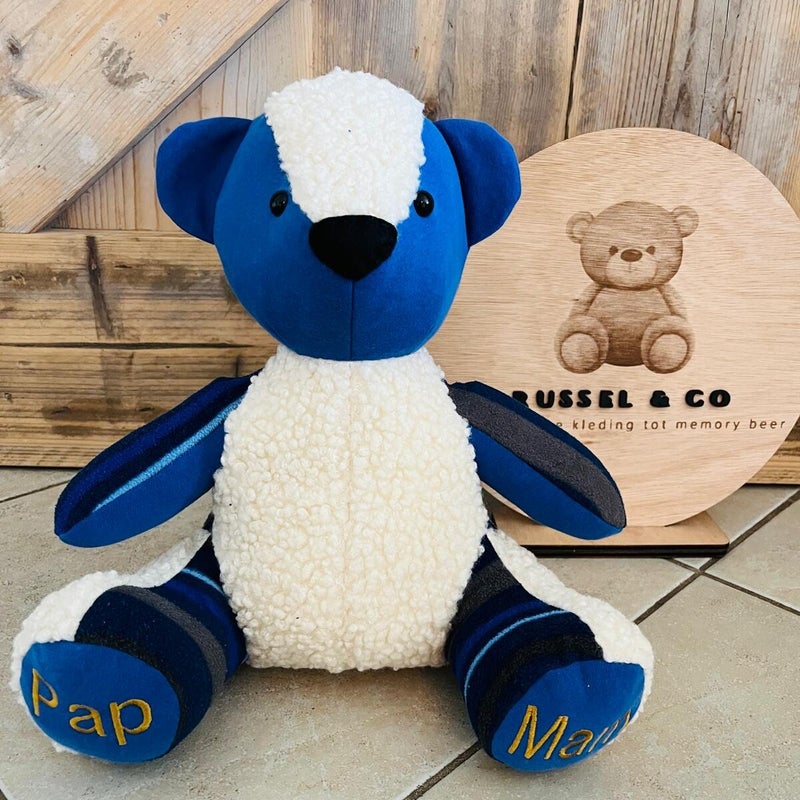 Prachtig hoe de kleding is omgevormd tot een mooie herinnering in een (knuffel) beer. Ik ben er onwijs blij mee. Tevens een erg fijn contact met de maker Russel & Co. Super erg bedankt!